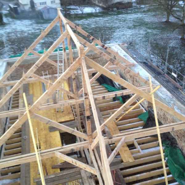 Nous proposons aussi un service de rénovation d’anciennes charpentes par pannes et chevronnages, en conservant la structure existante bonne et saine. Nous avons l’habitude d’opérer sur de vieilles charpentes vosgiennes et connaissons parfaitement les types de bois utilisés ainsi que leurs réactions. Une étude de calcul des bois est réalisé par l’entreprise pour ce faire.